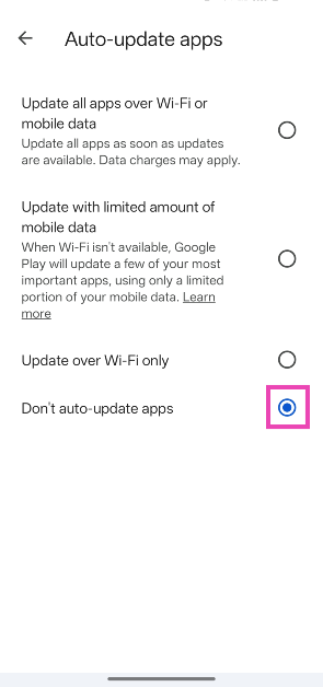 Google Playストアに移動し、プロフィール写真をタップし、設定>ネットワーク設定> Auto-Updateアプリ、および「Auto-UpDateアプリを選択しないでください」を選択します。