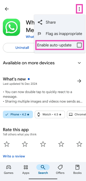 特定のアプリ(この場合はWhatsApp)の自動更新を無効にし、Playストアでページを開き、楕円を押して、「Auto-Updatesを有効にする」の隣にあるボックスを外したい場合。