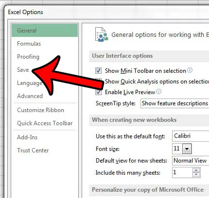 ステップ4:クリックします保存の左列のタブExcelオプションウィンドウ。