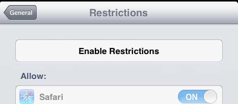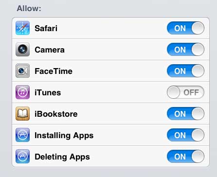 これにより、iPad 2を使用する人がiPad 2から音楽、テレビ番組、映画などのiTunesの購入を行うことを防ぐことができます。ただし、このチュートリアルの過程で、iPadの他の部分へのアクセスを制限できるメニューに移動します。これらの機能を無効にすることができます。