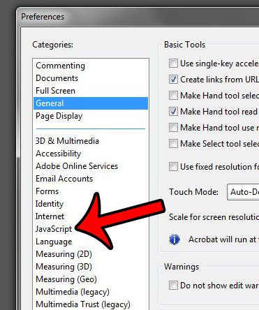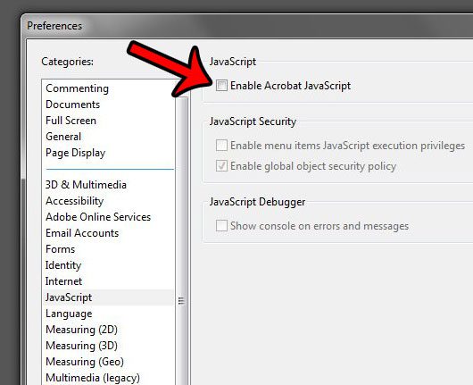 ステップ4:左側のボックスをクリックしますAcrobat JavaScriptを有効にしますチェックマークをクリアしてオフにします。その後、クリックしますわかりました窓の下部にあるボタンは、変更を適用します。