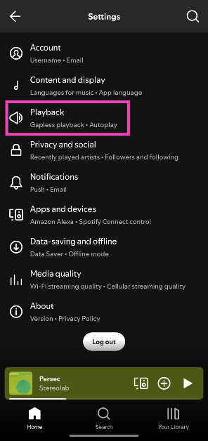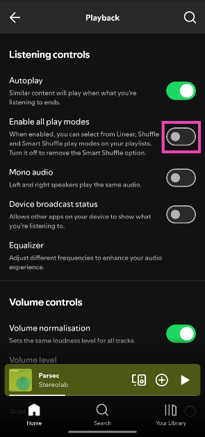 Spotifyアプリのプロフィール画像をタップし、設定とプライバシー>再生に移動し、「リスニングコントロール」の下で「すべての再生モードを有効にする」トグルスイッチをオフにします。