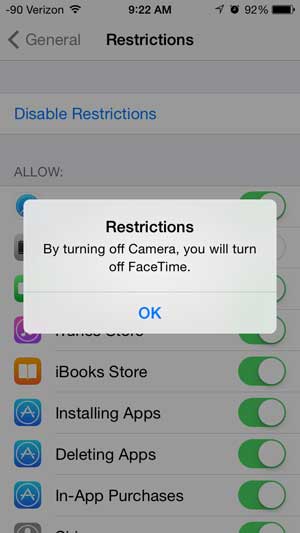 ステップ7:右側のボタンをタッチしますカメラ。以下のようなポップアップ通知を取得し、これがFaceTimeもオフになることを知らせます。
