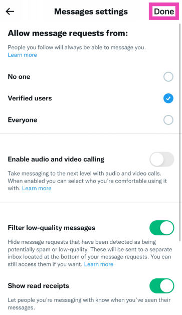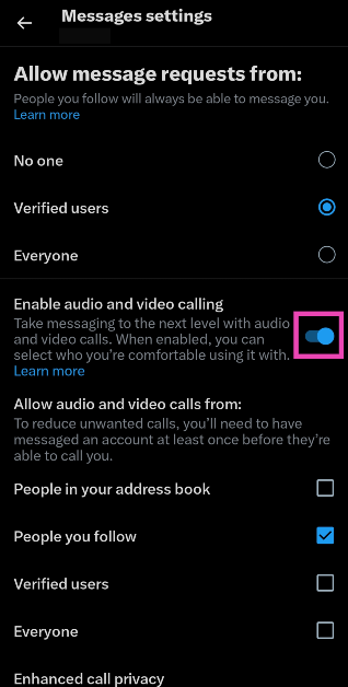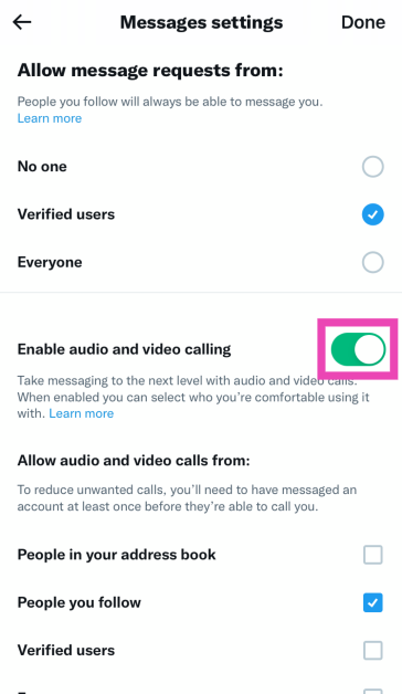 X/Twitterの誰でもプラットフォームで電話をかけるか、フォローしている人、アドレス帳(電話の連絡先)、または検証済みのユーザーに制限できるようにすることができます。