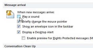ステップ5:を見つけますメッセージの到着メニューのセクションで、の左側のボックスをクリックしますサウンドを演奏しますチェックマークをクリアする。