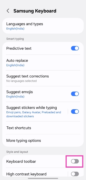 行きます設定>一般管理> Samsungキーボード設定「キーボードツールバー」の横にあるトグルスイッチをオフにします。