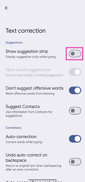 ツールバーの設定アイコンを押して、テキスト修正に移動し、「提案ストリップを表示」の横にあるトグルスイッチをオフにします。
