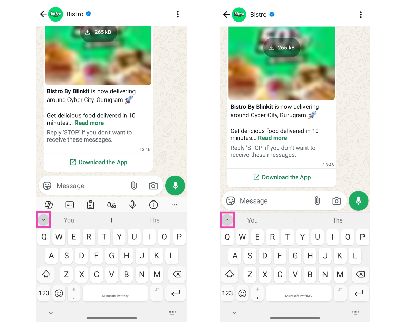 Microsoft Swiftkeyキーボードのツールバーは、予測テキストバーの左隅にある矢印アイコンをタップすることで隠すことができます。