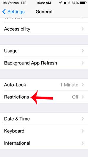 このチュートリアルでは、デフォルトでiPhone 5にインストールされているWebブラウザであるSafariを無効にする方法を特に示していることに注意してください。 Chromeなどの別のWebブラウザーがインストールされている場合は、この記事の手順に従ってそのブラウザを削除する必要があります。また、以下のチュートリアルでナビゲートするのと同じ画面で実行できるアプリストアへのアクセスを無効にする必要があります。