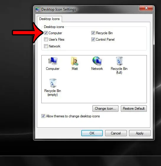 ステップ4:左側のボックスを確認しますコンピューター下デスクトップアイコン、 クリック適用するウィンドウの下部で、クリックしますわかりましたボタン。
