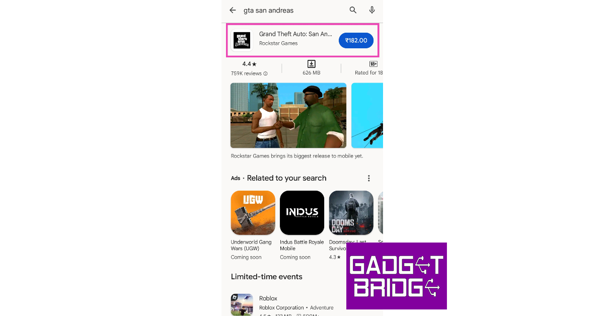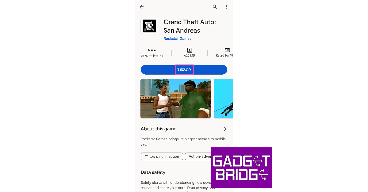 GTA San Andreasは現在、Google Playストアの182ルピーで価格設定されています。