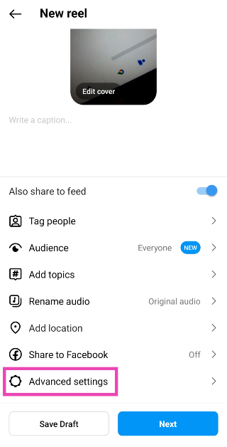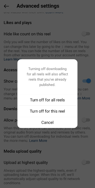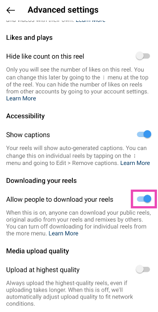 他の人にリールをダウンロードしたくない場合は、プロフィールをプライベートに設定するか、リール共有ページの高度な設定に移動して、「リールをダウンロードできるようにする」ためにトグルスイッチをオフにします。