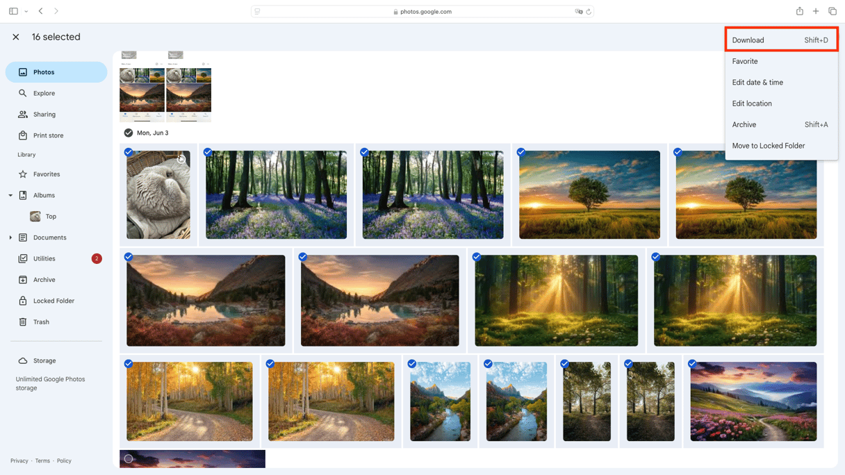 - Googleフォトにすべての選択はありませんので、最新の写真を選択し、シフトを押し続け、最古の写真を選択する必要があります。