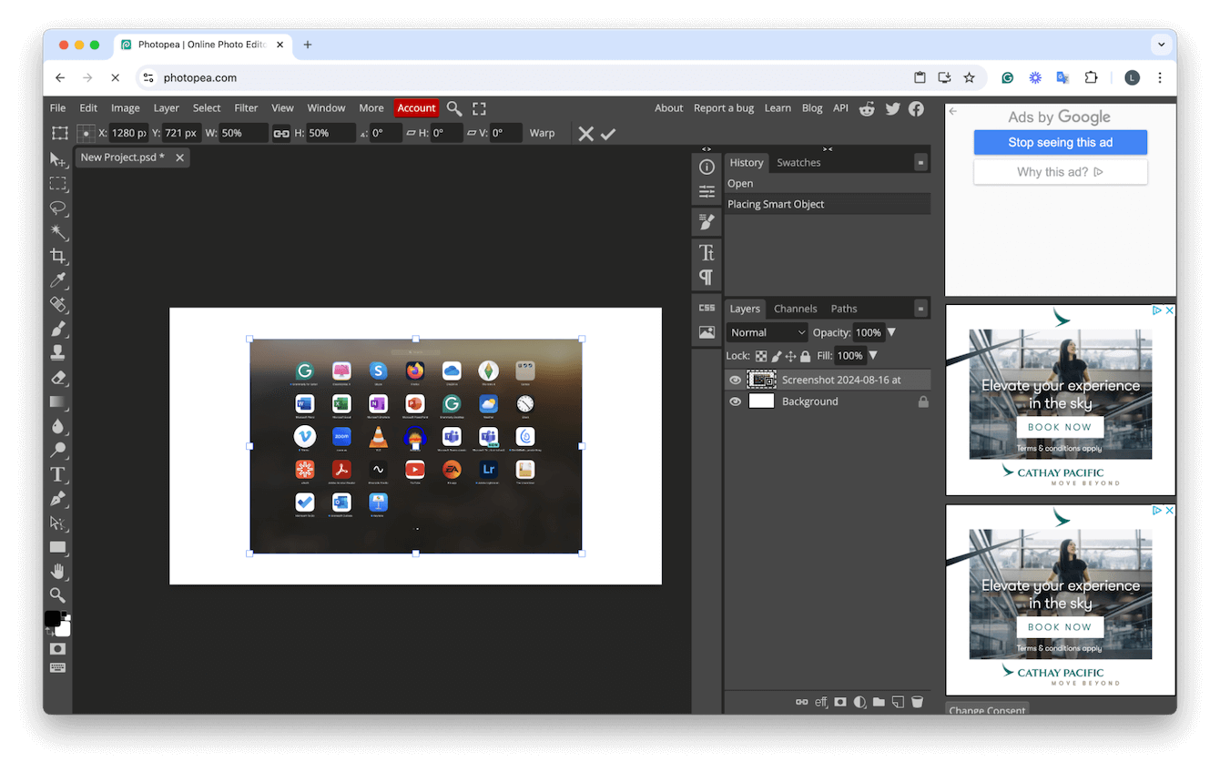 強引Photoshopに代わる無料の有名なオンラインの代替品です。それはほぼ同じ機能と機能を備えています。つまり、スクリーンショットを本当にレベルアップできることを意味します。多くの機能にはグラフィックデザインの知識が必要であるため、Canvaほど使いやすくありません。コンテストの広告がありますが、グラフィックデザインに堪能な場合は、素晴らしい無料ツールです。