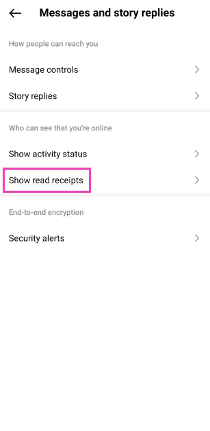 Instagram DMSでチャットを開き、上部の名前をタップし、「プライバシーと安全」を選択し、「読み取り領収書」のトグルスイッチをオフにします。