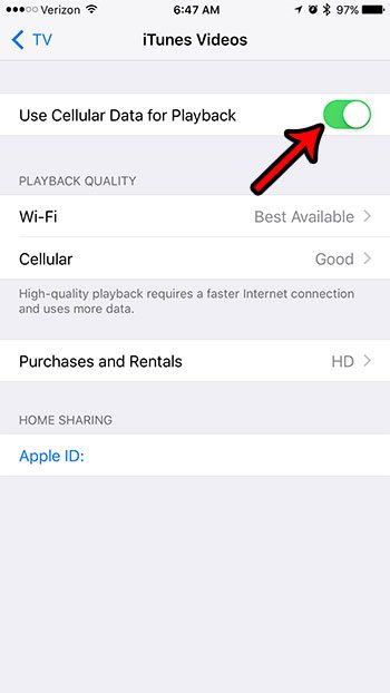ステップ4:右側のボタンをタップします再生にはセルラーデータを使用します。ボタンの周りに緑色のシェーディングがあるときにオンになっていることがわかります。