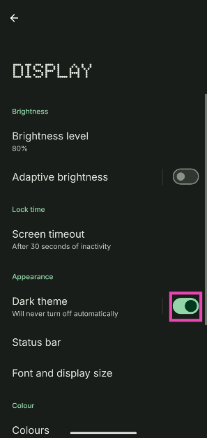 目にはあまりストレスがかかりません:夜遅くに携帯電話をスクロールする習慣がある場合は、明かりを点灯せずに携帯電話をスクロールする習慣がある場合、明るいディスプレイが目にかなりの圧力をかけることに気付いたかもしれません。ダークモードをオンにすることで、このストレスを減らすことができます。まぶしさを切り取り、青い光への露出を減らすことにより、暗いモードはあなたの目が疲れを感じないようにします。