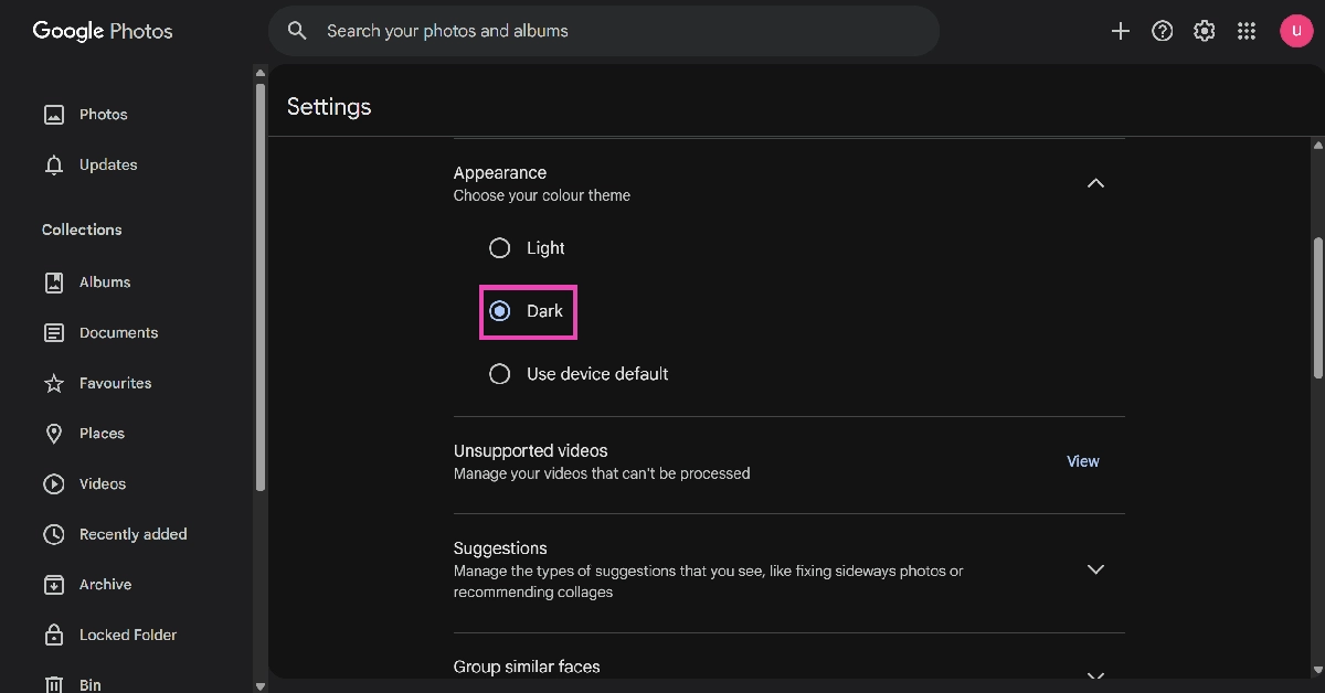 photos.google.comに移動し、コグホイールアイコンをクリックし、「外観」カテゴリを展開し、リストから「ダーク」を選択します。