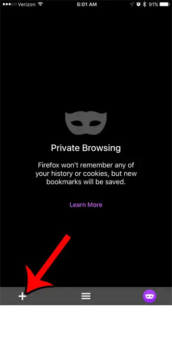 ステップ4:画面の左下の角にある +アイコンをタッチして、新しいFirefoxプライベートブラウジングタブを開きます。