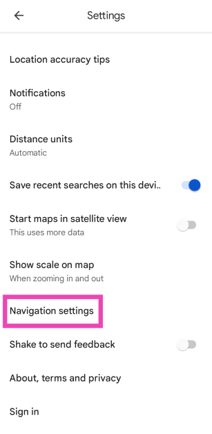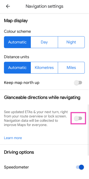 Googleマップを起動してください設定>ナビゲーション設定、そして、「運転中にグランス可能な方向」のトグルスイッチをオンにします。