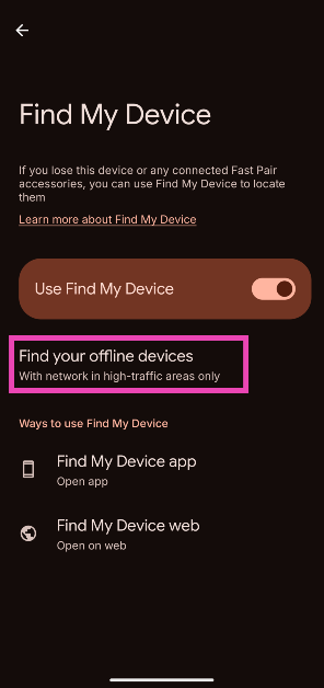 それでは、オフラインの追跡はどのように機能しますか?答えは簡単です。デバイスがオフラインになると、Bluetooth信号を近くのAndroidデバイスに発し、その位置データをGoogleに報告します。基本的に、失われたデバイスはBluetoothビーコンとして機能し、その近くのスマートフォンに依存して情報を中継して私のデバイスを見つけます。私のデバイスを見つけてオフライン追跡を有効にすると、他の失われたデバイスを見つけるためにネットワークの一部であることも選択しています。
