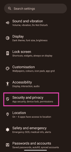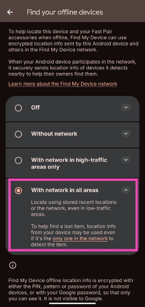 Androidスマートフォンに行きます設定>セキュリティとプライバシー>デバイスファインダー>デバイスを見つける>オフラインデバイスを見つけます「すべての領域でネットワークを使用して」を選択します。