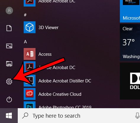 ステップ2:スタートメニューの左下にあるギアアイコンを選択します。