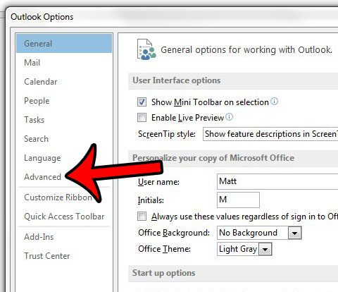 ステップ4:クリックします高度なの左側のタブOutlookオプションウィンドウ。