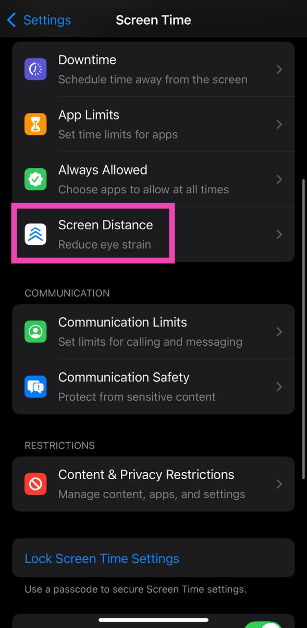 iPhoneで画面距離を有効にしている場合、顔から12インチ以内にデバイスを長く保持している場合、警告します。デバイス設定で画面時間に移動することで、これをオフにすることができます。