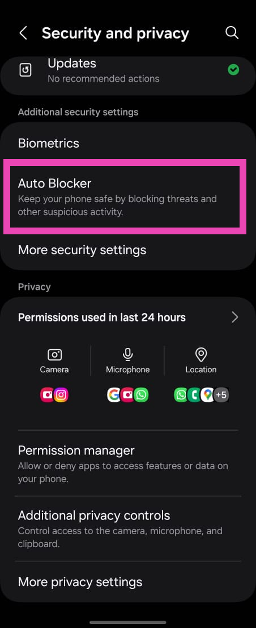 1つのUI 6.1.1は、サードパーティのソースからのアプリのインストールをユーザーが自動的にブロックします。この問題を回避するには、に進みます設定>セキュリティとプライバシー>オートブロッカートグルスイッチをオフにします。
