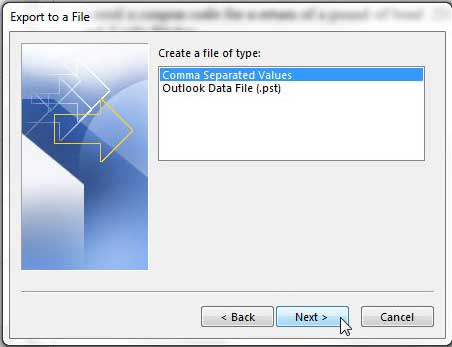 Outlook 2013の連絡先を.CSVファイル形式にエクスポートするプロセス中に、.pstファイルに代わりにエクスポートするオプションが与えられます。