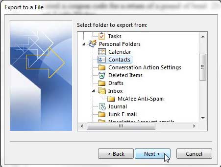 ステップ7:選択します連絡先下のオプションパーソナルフォルダー、次にクリックします次ボタン。