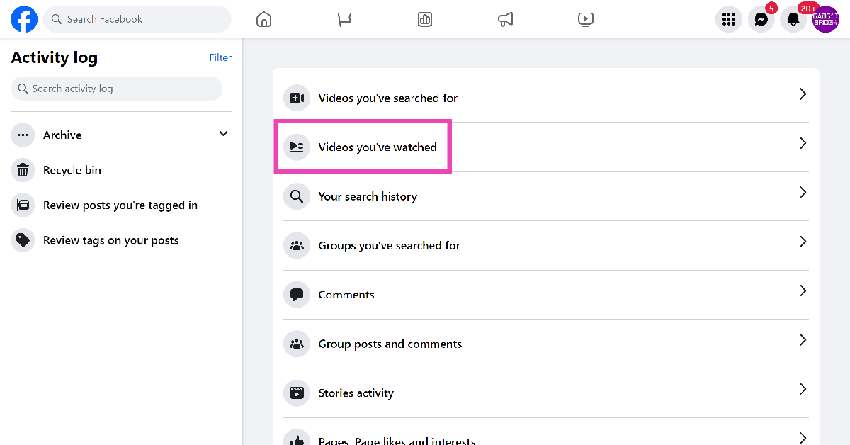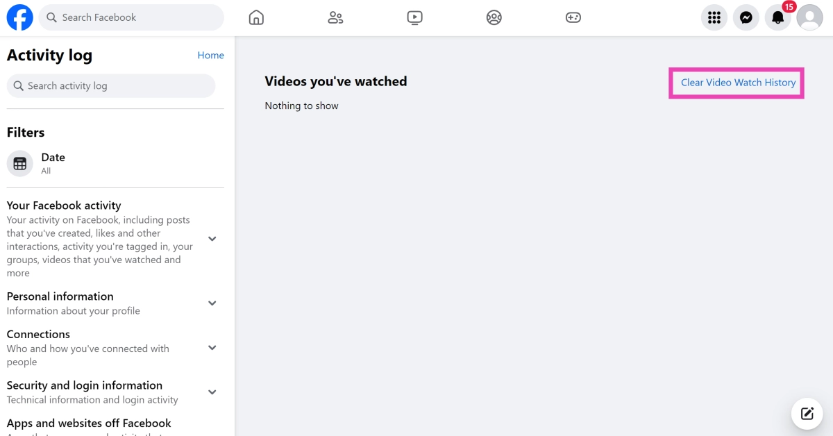 これを修正するには、時計履歴からビデオを削除できます。これにより、推奨されるコンテンツアルゴリズムへの影響が減ります。ビデオ履歴を削除したいと思うもう1つの理由は、Facebookのアクティビティをpr索好きな目から遠ざけることです。誰かがあなたのデバイスにアクセスできる場合、彼らはあなたの「アクティビティログ」にアクセスして、プラットフォームで見ているものを簡単に見つけることができます。
