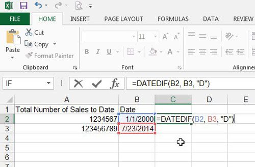 下の画像で使用する式は= datedif(b2、b3、“ d”)