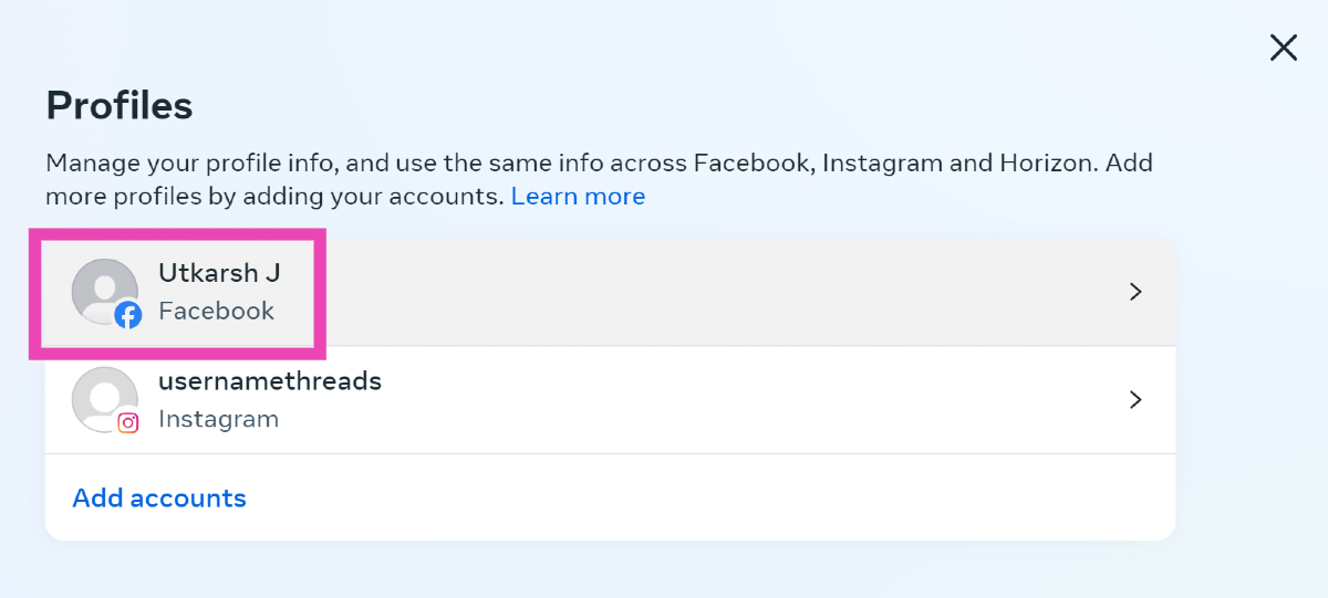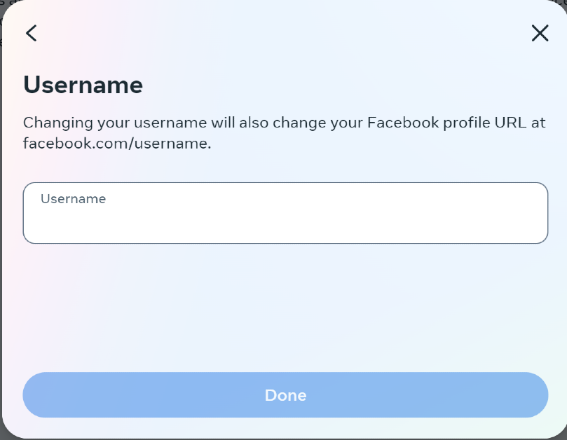 行きます設定とプライバシー>設定>アカウントセンター、Facebookプロファイルを選択し、ユーザー名をクリックし、ユーザー名を入力して、「done」を押します。
