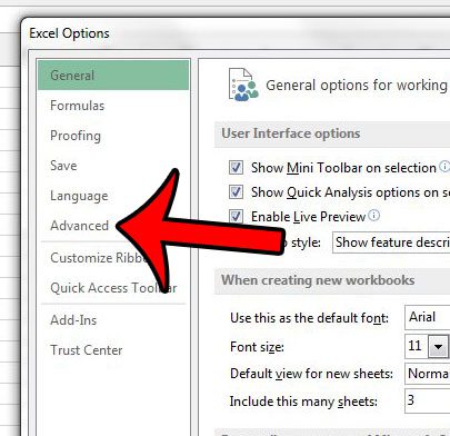 ステップ3:クリックします高度なの左側のタブExcelオプションウィンドウ。