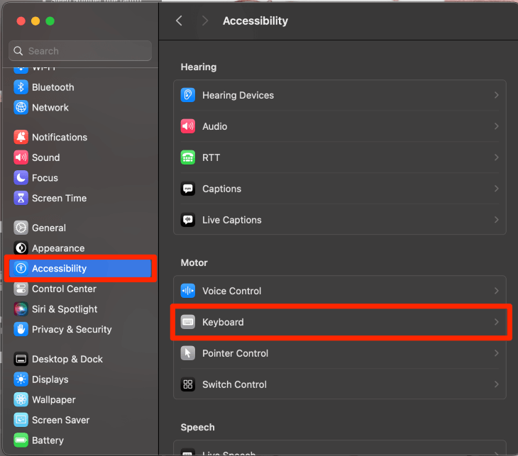 に移動します左側のアクセシビリティそして右側のキーボード。