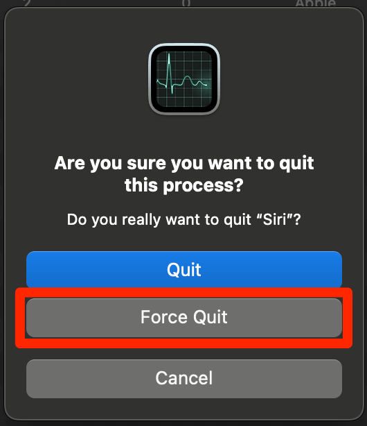 左上で検索Siri。 SIRIプロセスを選択して、をクリックしますx画面の上部に。