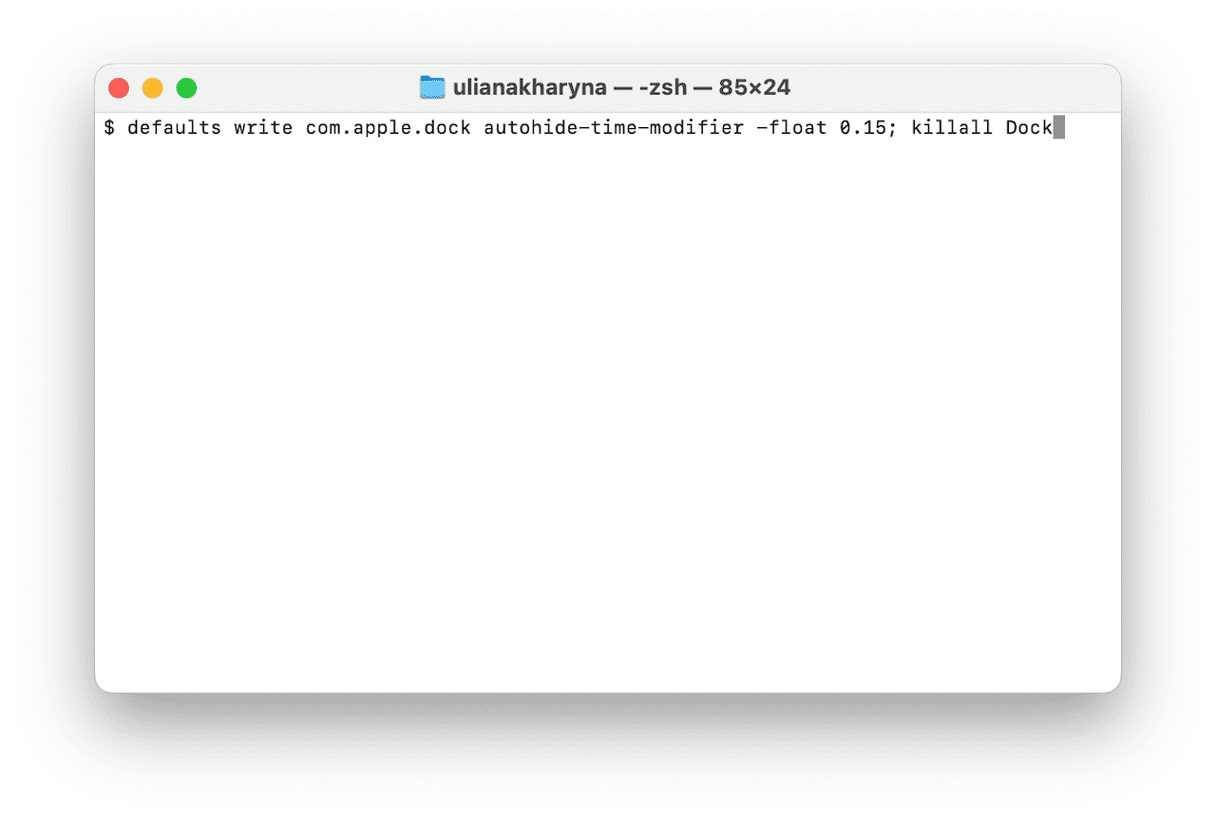 defaults write com.apple.dock autohide-time-modifier -float 0.15; killall Dock - Returnを押します。