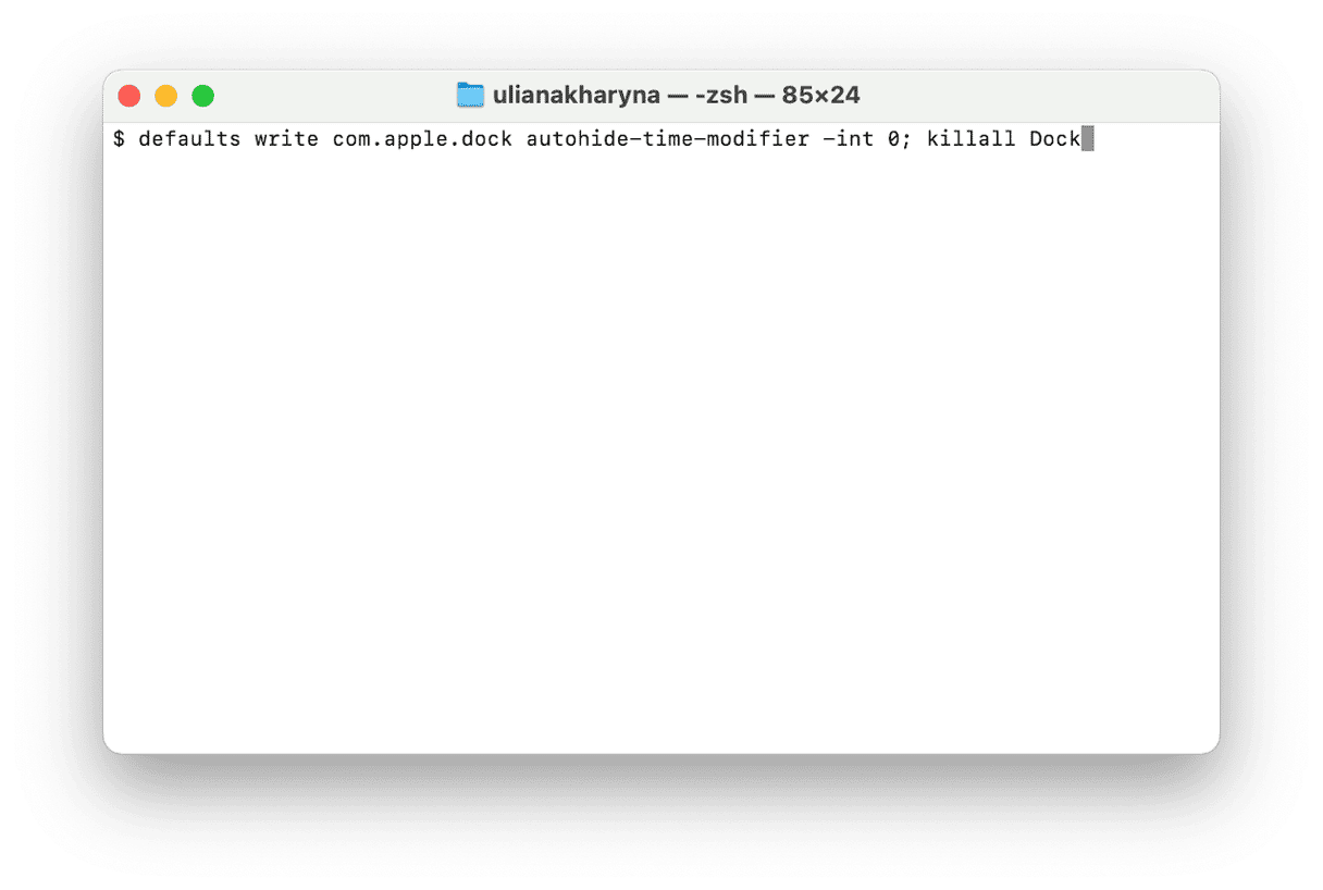 defaults write com.apple.dock autohide-time-modifier -int 0; killall Dock - ターミナルを終了します。