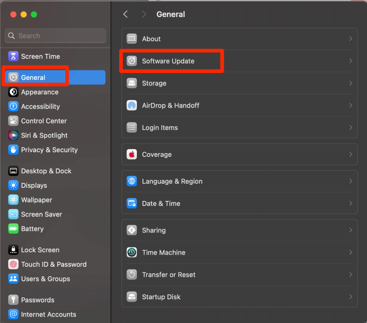 左側に、に移動します一般的な。次に、選択しますソフトウェアアップデート右側に。