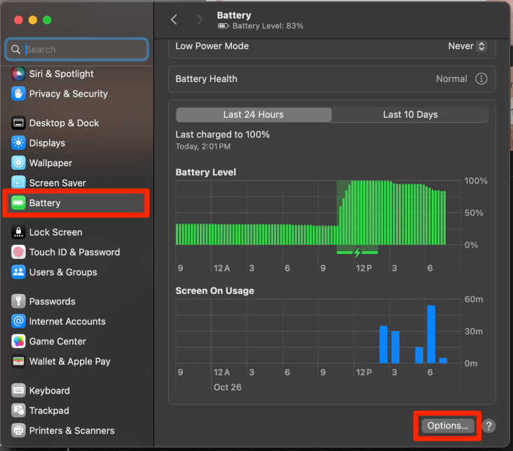 でシステム設定、に移動しますバッテリー左に。選ぶオプション右下隅。