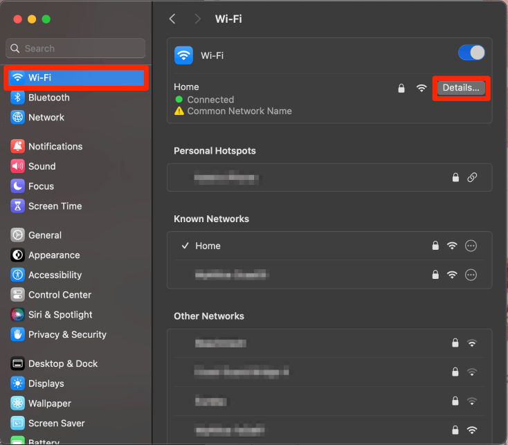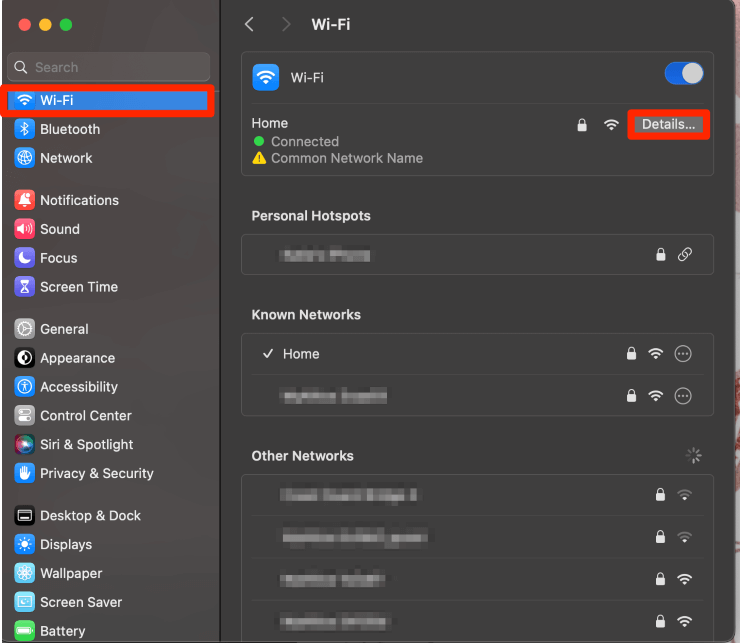 再びシステム設定、選択Wi-Fi左に。次に、クリックします詳細…Wi-Fiネットワークの隣。