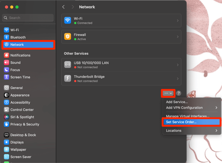 もう一度、システム設定、に移動しますネットワーク左に。右側で、3つのドットを選択します。次に、選択しますサービスの注文を設定します…表示されるメニューに。