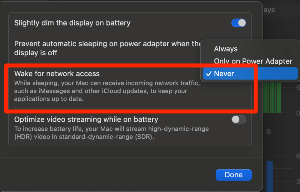 - 選択電源アダプターでのみつまり、Macは眠っているときにWi-Fiにのみ接続されたままであり、電源に接続されることを意味します。