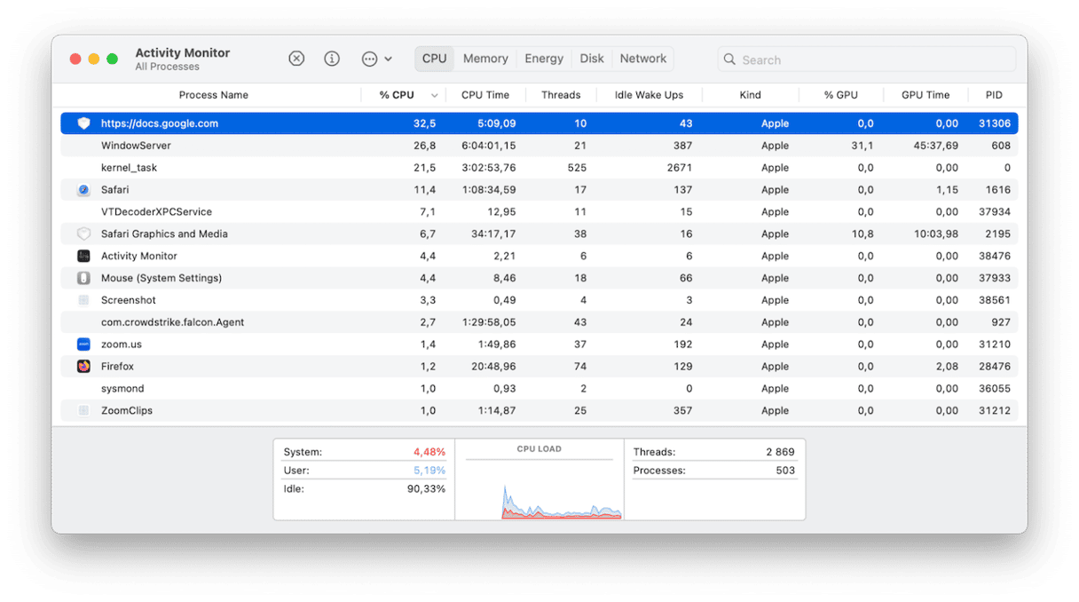 マックマウスが遅れている理由の1つは、CPUサイクルを抱きしめるプロセスがあることです。これが発生した場合、マウスポインターが移動する速度を含め、Mac上のすべてが遅くなります。それが当てはまるかどうかを確認するには、アクティビティモニターを使用してください。