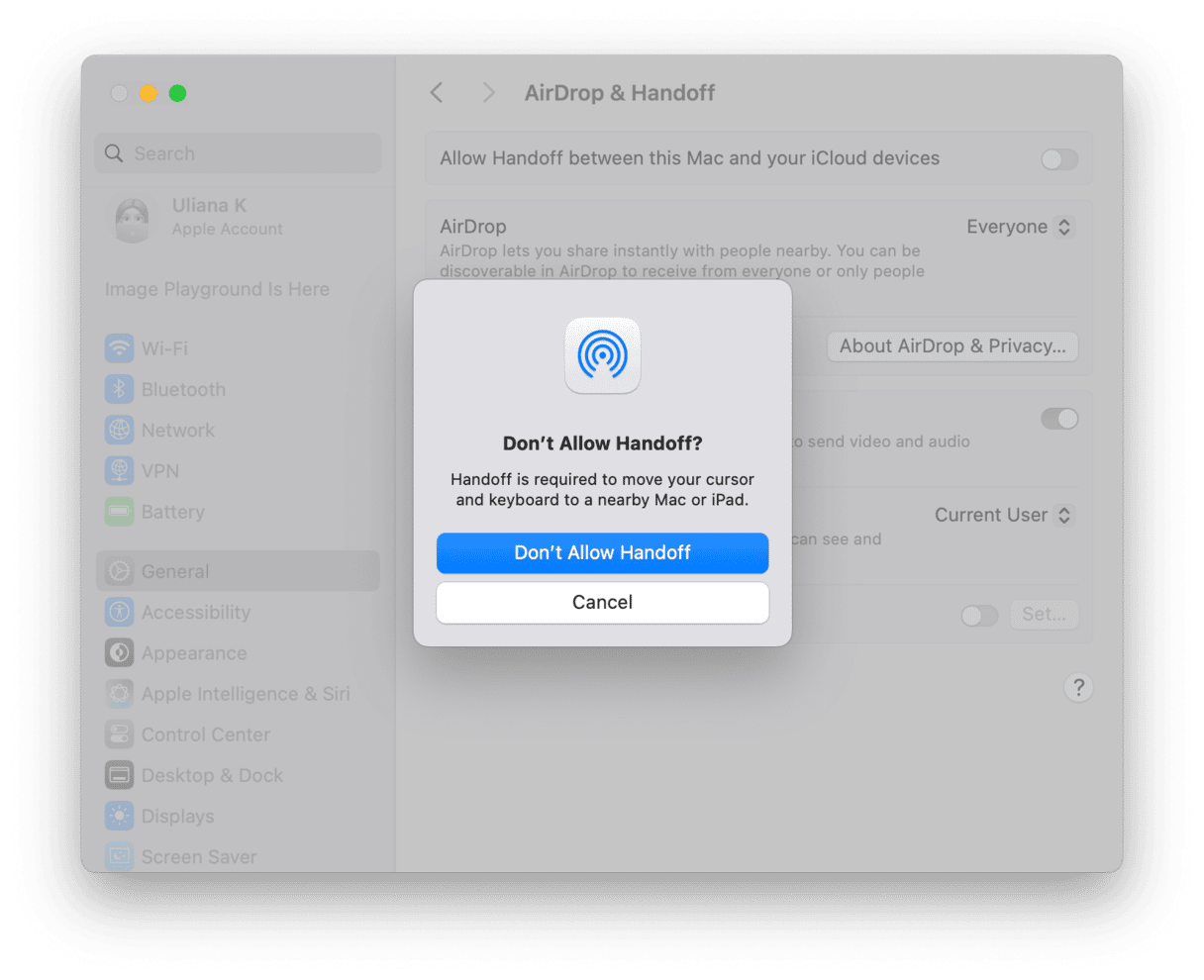 - トグル「このMacとiCloudデバイスの間のハンドオフ」がオフになります。