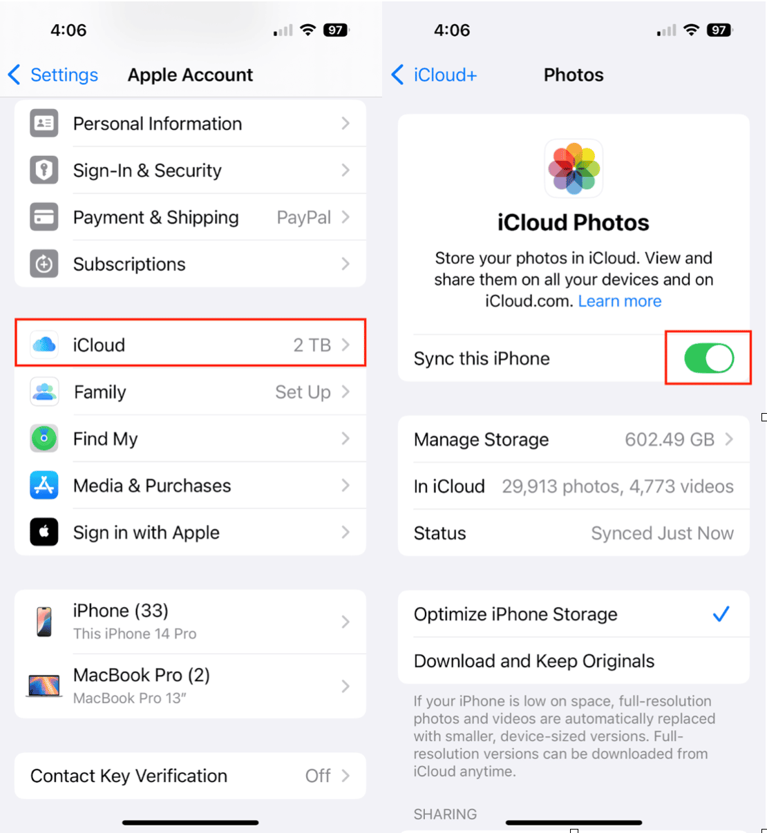 - iCloud写真を切り替えます(またはこのiPhoneを同期します)。