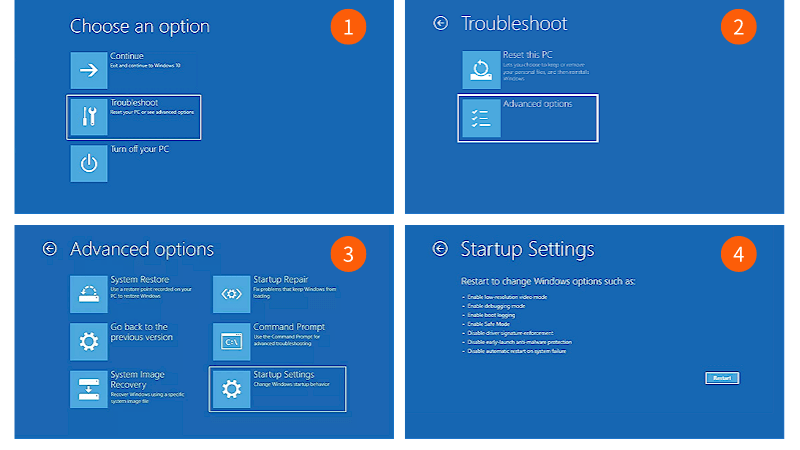 ステップ3:画面には、「」のあるブルースクリーンが表示されます。オプションを選択します」上部で。選択してくださいトラブルシューティング>高度なオプション>スタートアップ設定>再起動。