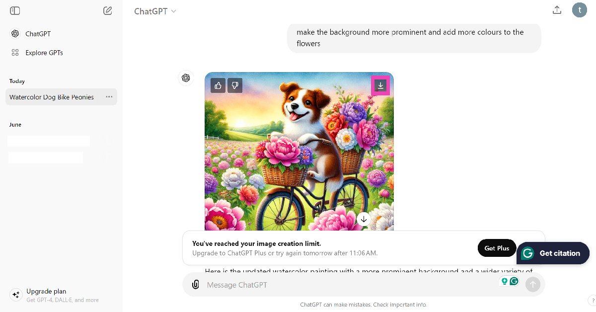 ステップ6:画像をダウンロードするには、その上のカーソルをホバリングしてヒットしますダウンロードボタン。今のところ、生成することしかできません2つのAI画像Dall-Eを使用した日のために。